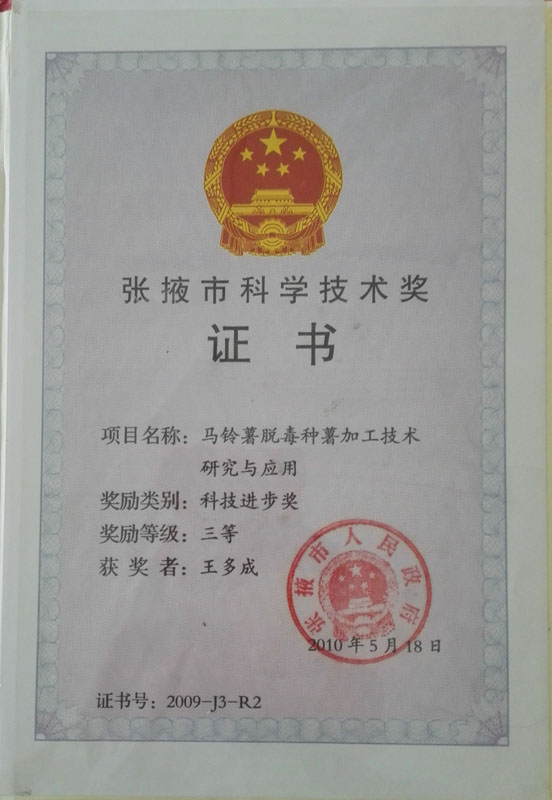 2010年榮獲張掖市科技進(jìn)步三等獎證書